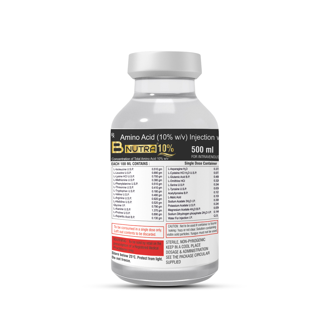 B-NUTRA 10% is a sterile, non-pyrogenic, hypertonic solution containing essential and non-essential amino acids along with electrolytes. It is designed for parenteral nutrition in patients requiring intravenous nutritional support.